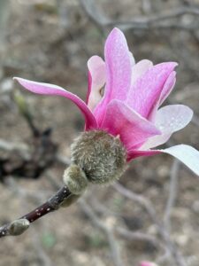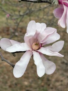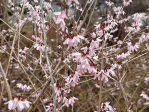 One of the earliest blooming shrubs in our synoptic border, Abeliophyllum distichum ‘Rosea’. This lovely fragrant shrub blooms at the same time as the forsythia but adds pink flowers to the landscape.